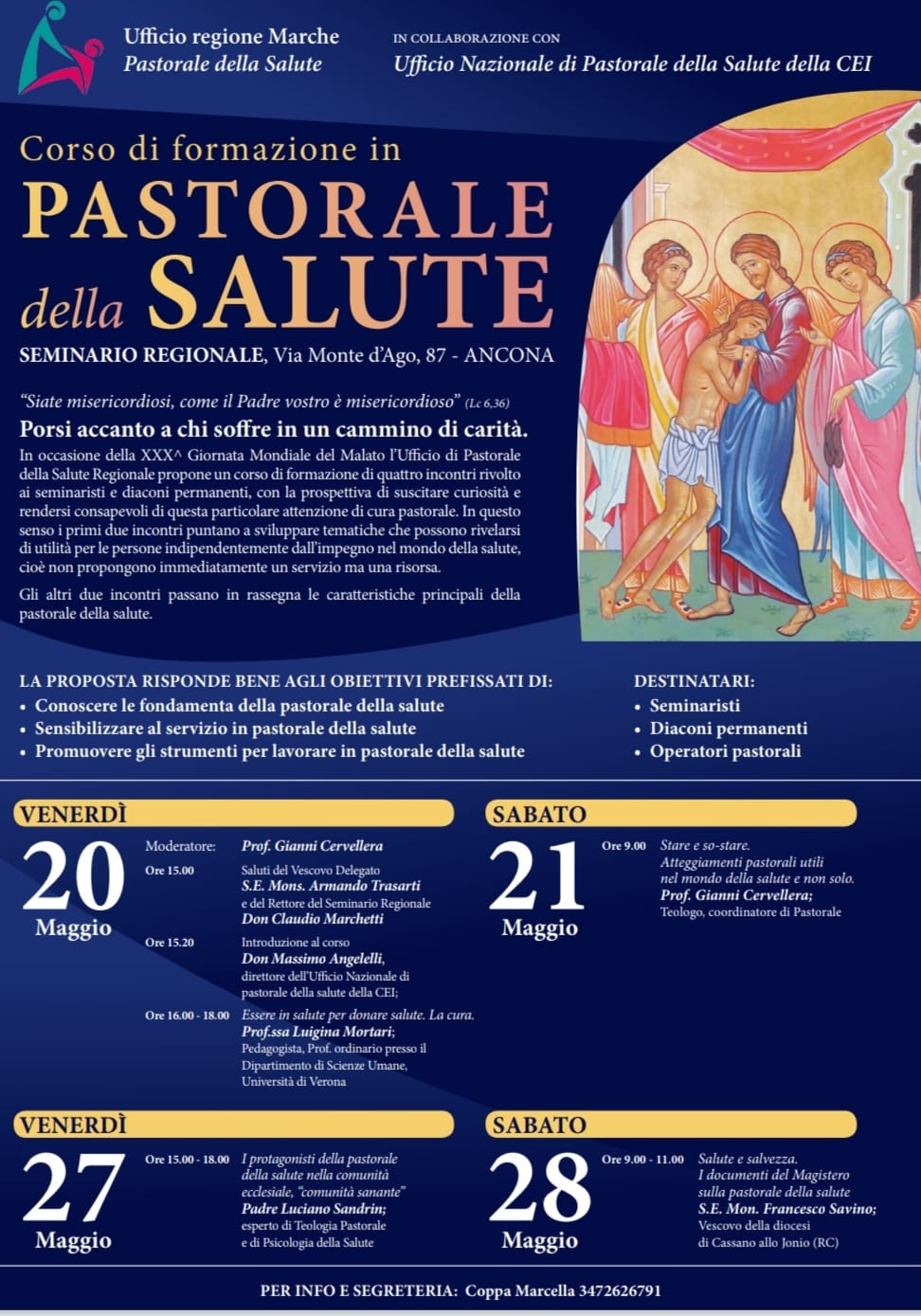 In occasione della XXX giornata del malato, gli uffici regionali e la CEI che si occupano della pastorale della salute, hanno avviato un corso di formazione per seminaristi, diaconi permanenti e operatori pastorali che si tiene presso il Seminario regionale ad Ancona in via Monte Dago (Google Maps). Gli ultimi due appuntamenti del 27-28 maggio ‘2022 riguardano le caratteristiche principali di questo spazio di sostegno a chi soffre.