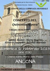 In occasione della giornata mondiale per la vita, Il Movimento per la vita organizza un concerto con il quartetto “Flutes Joyeuses”. Appuntamento domenica 12 febbraio 2023 alle ore 17:30 presso la Chiesa di S.Maria della Piazza ad Ancona (Google Maps).
