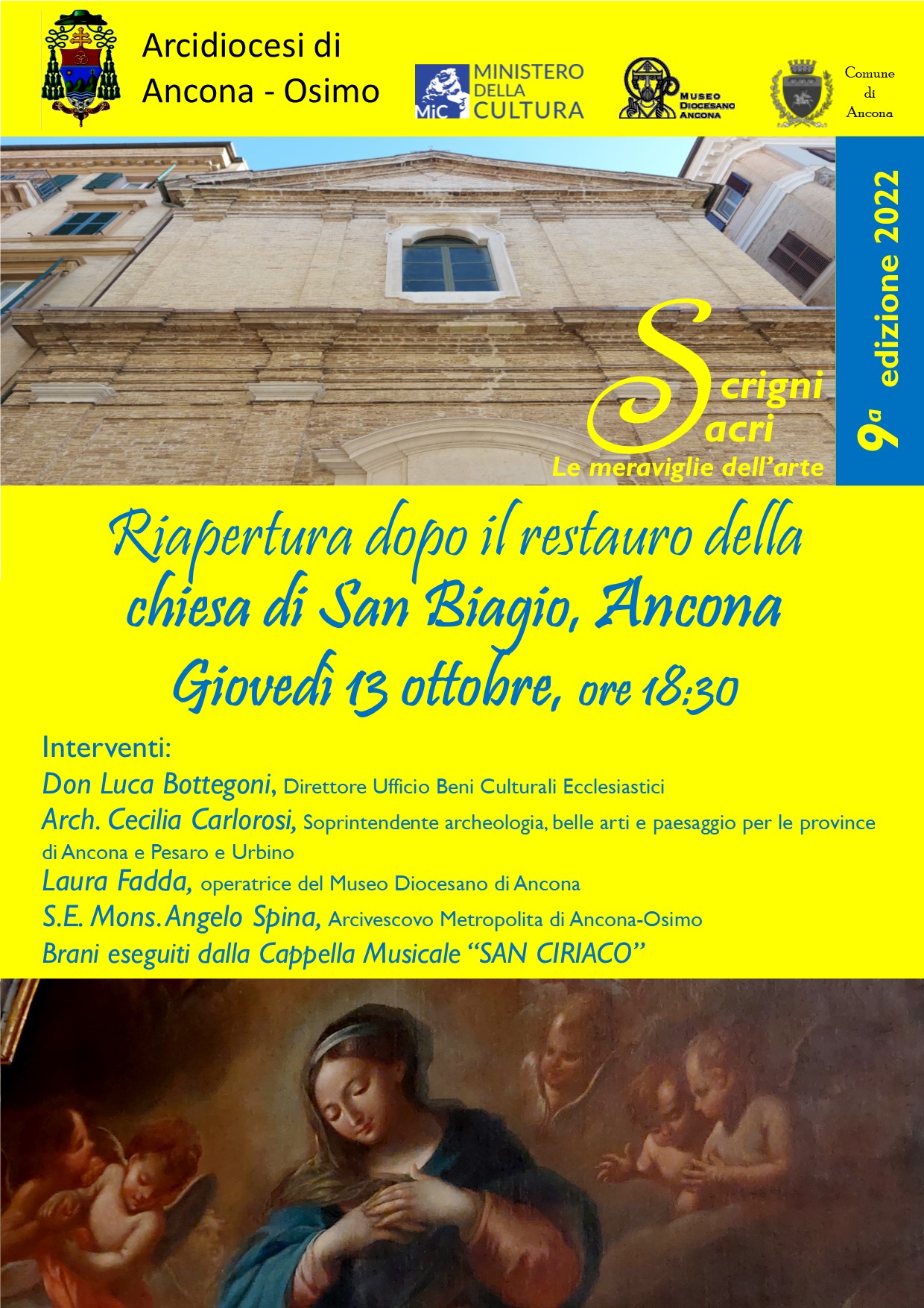 Dopo i lavori di restauro, la chiesa di San Biagio (Ancona) riaprirà giovedì 13 ottobre, alle ore 18.30. La riapertura della chiesa di corso Mazzini chiuderà la nona edizione della rassegna estiva “Scrigni Sacri. Le meraviglie dell’arte”, organizzata dal Museo Diocesano di Ancona.