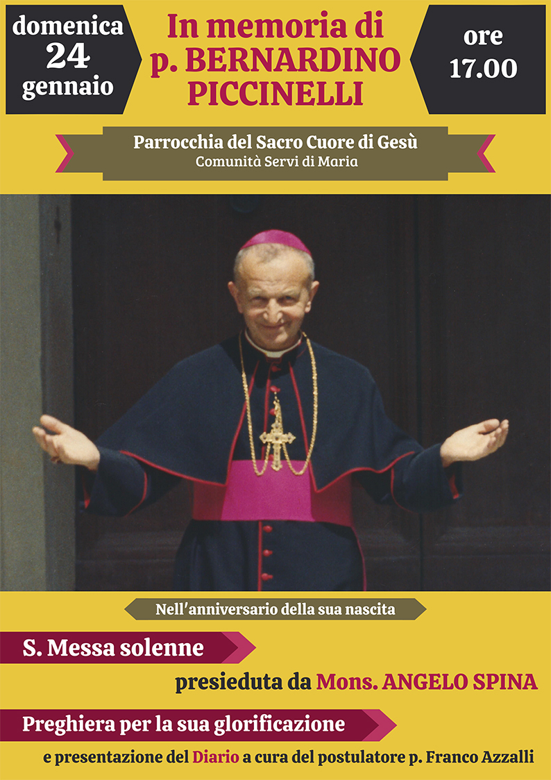Domenica 24 gennaio 2021 la comunità dei Servi di Maria nella Parrocchia del S.Cuore di Via Maratta ad Ancona (Google Maps), insieme con tutta la comunità parrocchiale, nell’anniversario della sua nascita, organizza un pomeriggio di preghiera che comprende la S.Messa solenne celebrata dal nostro Arcivescovo Mons Spina; una preghiera particolare per la sua glorificazione e, a cura di p. F.Azzali, la presentazione del Diario.