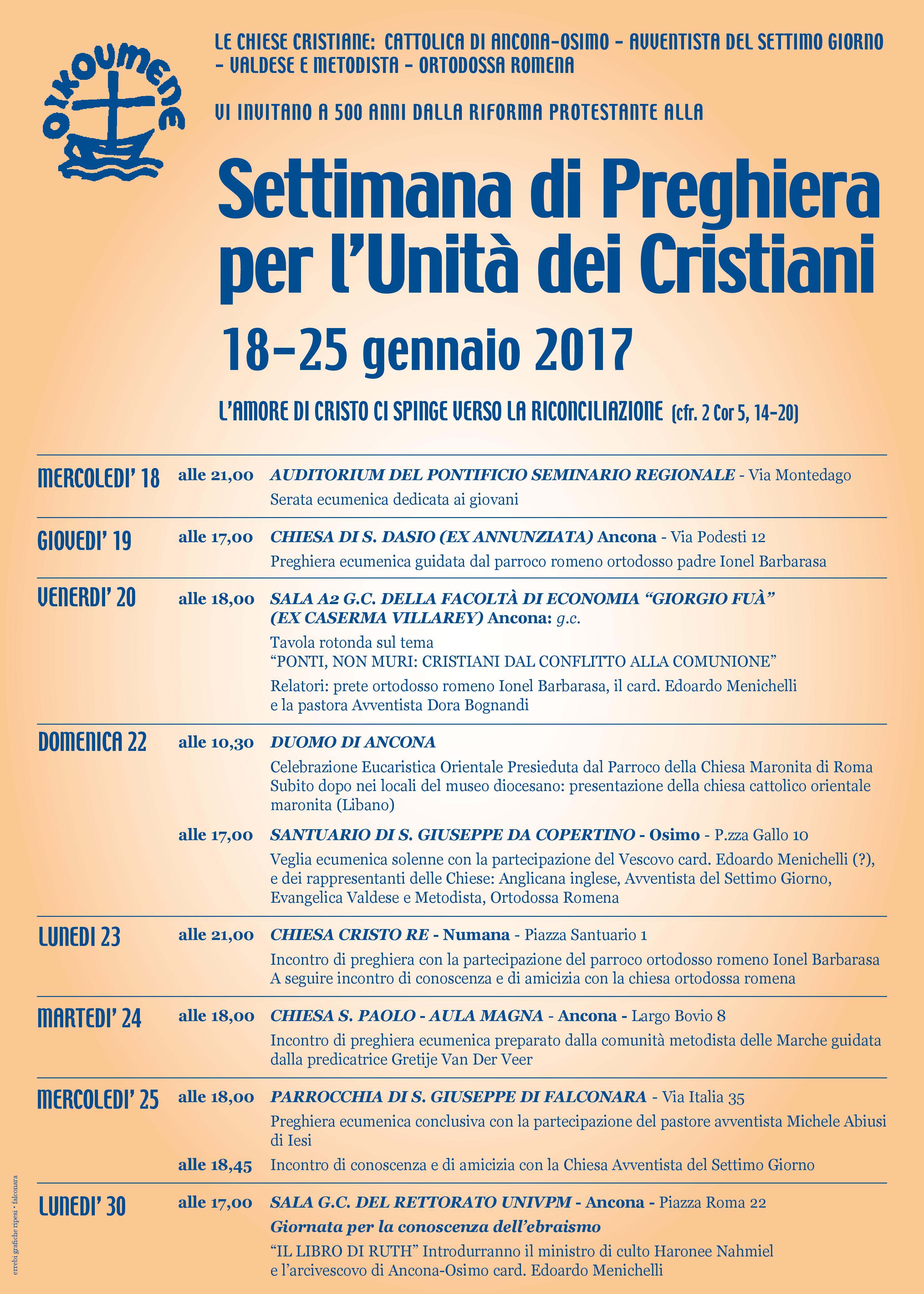 Ecumenismo, Eventi diocesani 8 Gennaio 2017 andreaf Serata ecumenica dedicata ai giovani mercoledì 18 Gennaio Inizio: 18/01/2017 00:00 Fine: 18/01/2017 23:59 Categorie: Eventi diocesani, Ecumenismo CONDIVIDIemailPrintFacebookTwitter
