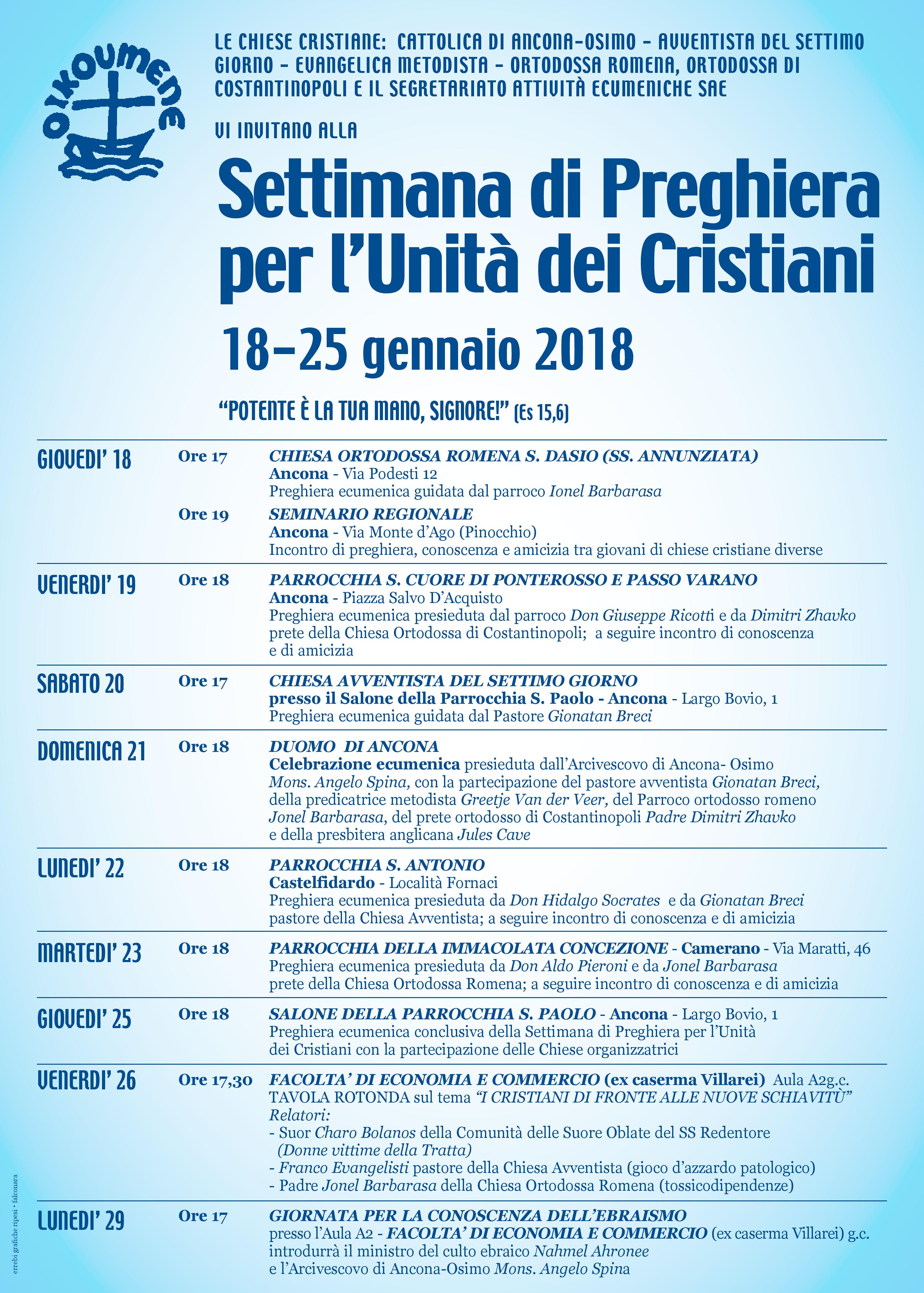 Ecumenismo, Eventi diocesani 14 Gennaio 2018 andreaf Settimana di preghiera per l’unità dei cristiani 2018 giovedì 25 Gennaio Inizio: 25/01/2018 00:00 Fine: 25/01/2018 23:59 Categorie: Eventi diocesani, Ecumenismo CONDIVIDIemailPrintFacebookTwitter