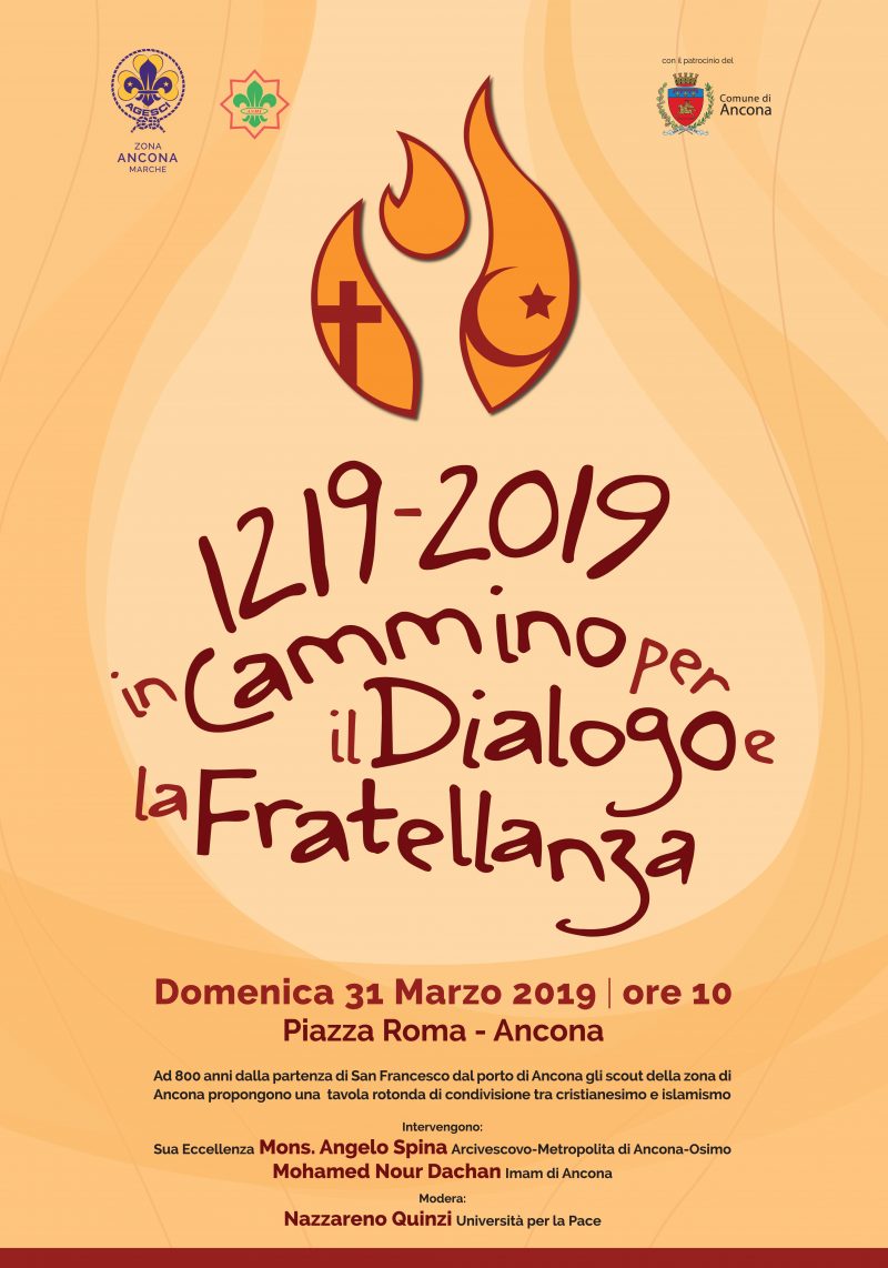 Gli Scout AGESCi Zona di Ancona, con il patrocinio dell’Amministrazione comunale, organizzano una tavola rotonda, domenica 31 marzo alle ore 10 in P.zza Roma, dal titolo “1219-2019 in Cammino per il Dialogo e la Fratellanza”. Interverranno Sua Eccellenza Mons. Angelo Spina, Arcivescovo della Diocesi Ancona-Osimo, Mohamed Nour Dachan, Presidente della Comunità islamica marchigiana e Nazzareno Quinzi, Universitá della Pace in qualitá di moderatore. L’evento inizierà … Continua a leggere domenica31Marzo 00:00 1219-2019 in Cammino per il Dialogo e la Fratellanza 31/03/2019 00:00 »