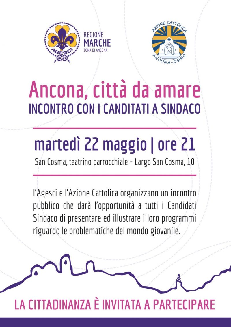 L’AGESCI e l’Azione cattolica organizzano per martedì 22 maggio 2018 alle ore 21 presso il teatrino di S.Cosma ad Ancona un incontro con i candidati a Sindaco della città per conoscere i loro programmi specie in relazione alle problematiche giovanili.