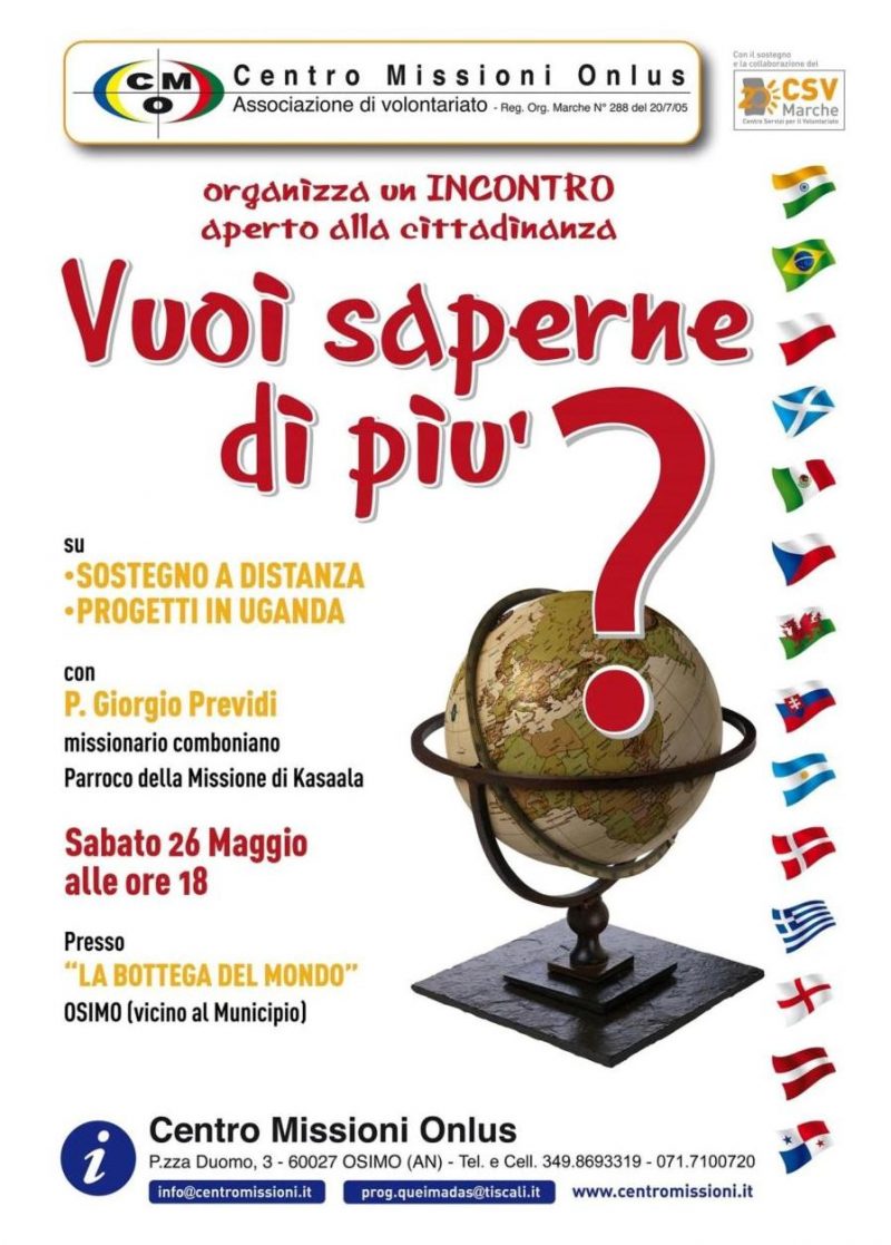 E’ il titolo dell’incontro che il Centro Missioni di Osimo organizza con la presenza di padre G.Previdi, missionario, parroco in Africa della Missione del Kasaala, per approfondire il tema del sostegno a distanza in particolare dei progetti in Uganda,. . Appuntamento sabato 25 maggio 2018 alle ore 18 presso la Bottega del mondo solidale