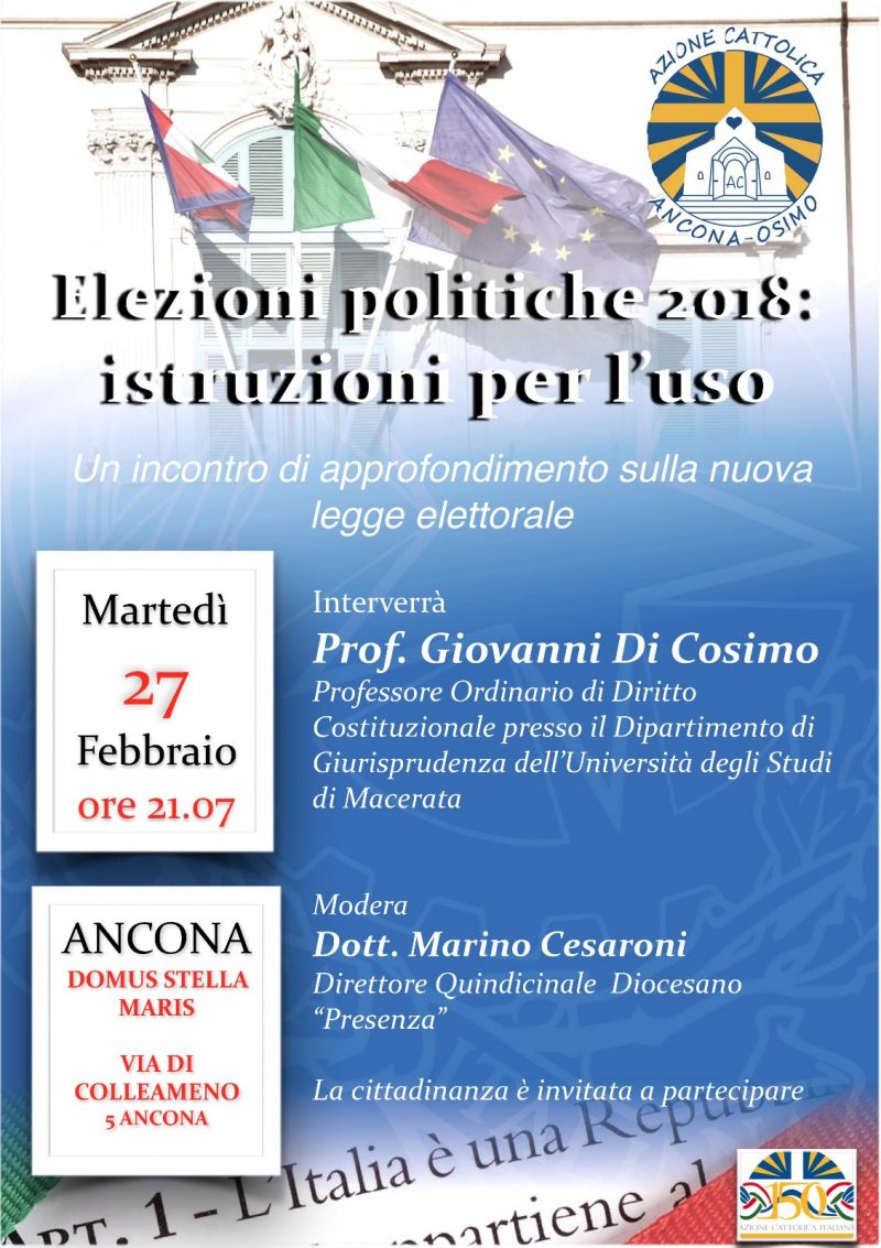 L’Azione Cattolica di Ancona – Osimo organizza per il 27 febbraio 2018 alle ore 21, a Colle Ameno-Torrette di Ancona un incontro dal titolo “Elezioni politiche 2018 Elezioni politiche 2017 – istruzioni per l’usoIstruzioni per l’uso” allo scopo di approfondire la nuova legge elettorale. Relatore il prof G. Di Cosimo dell’Università di Macerata. Moderatore il dr. M. Cesaroni direttore del quindicinale Presenza. L’evento è aperto … Continua a leggere martedì27Febbraio 00:00 ATTENZIONE – Approfondiamo la legge elettorale 27/02/2018 00:00 »