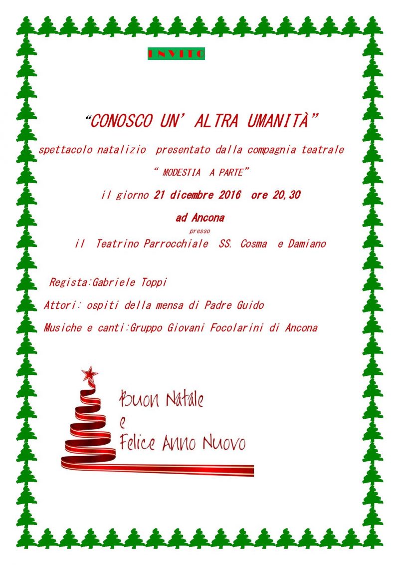 Lo spettacolo è stato rimandato a data da destinarsi per un lutto improvviso all’interno della compagnia Gli ospiti della mensa di P.Guido presentano il 21.12 .2016 alle ore 20.30 presso il teatrino S.Cosma uno spettacolo teatrale dal titolo “Conosco un’altra umanità” con la compagnia “Modestia a parte”. I particolari nel volantino-invito che pubblichiamo