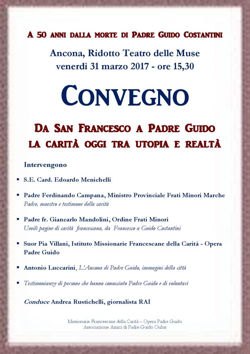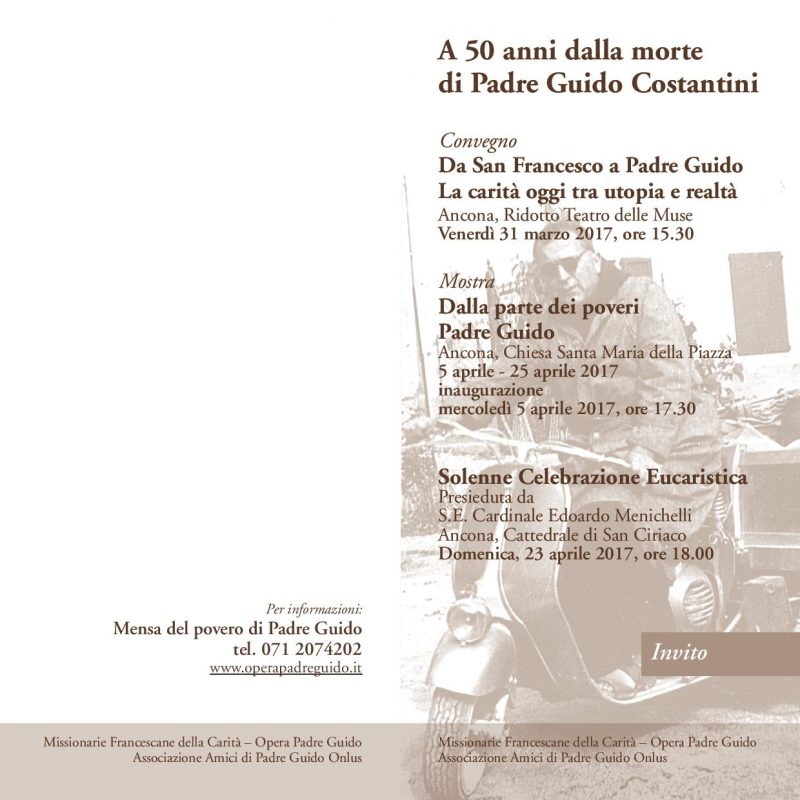 Ancona ricorda padre Guido Costantini a 50 ani dalla morte con un evento al Ridotto delle Muse di Ancona venerdì 31.3.2017 alle ore 15,30. Interverranno, con il cardinale Menichelli, numerose personalità che racconteranno di lui del suo cammino di fede e di opere inserite nella realtà anconetana. L’evento è condotto dal giornalista RAI A.Rustichelli. I particolari nella locandina pubblicata.