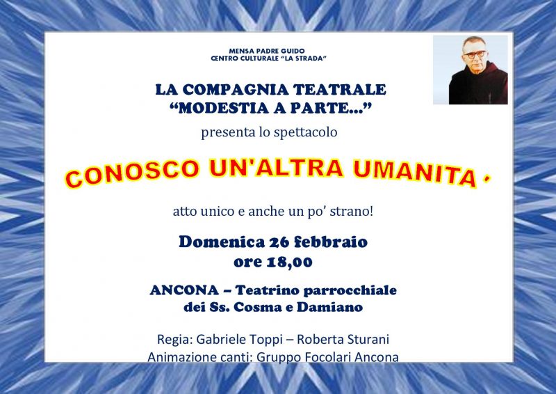 Teatro con il gruppo della mensa di Padre Guido Il Centro culturale “La strada” della mensa P. Guido presenta domenica 26.2.2017 alle ore 18 presso il teatrino parrocchiale di S.Cosma e Damiano ad Ancona la compagnia teatrale “Modestia a parte” con l’atto unico “Conosco un’altra umanità” Un’esperienza da non perdere! Vedi il volantino.