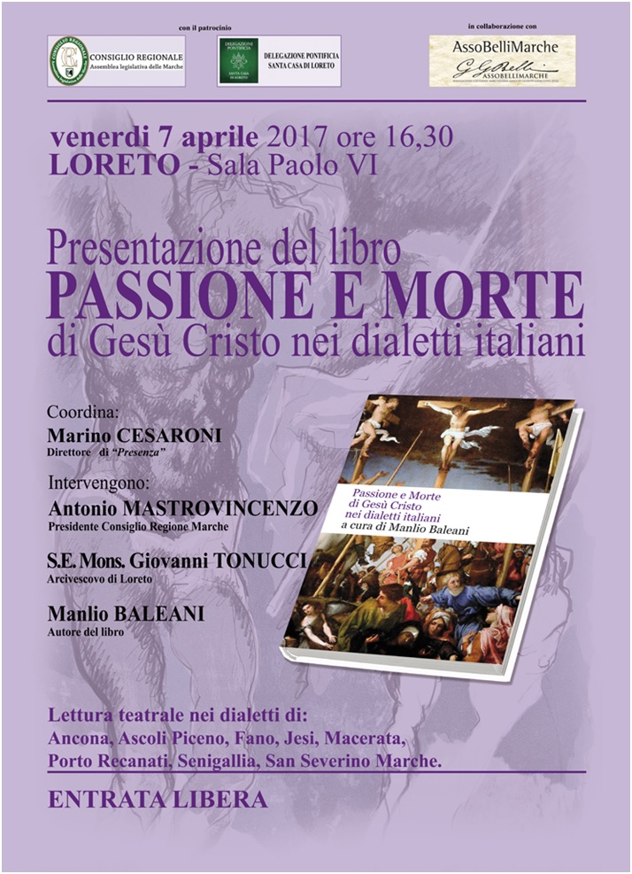 Questo è il titolo del libro curato da M.Baleani che sarà presentato a Loreto venerdì 27 aprile alle ore 16,30 nella sala Paolo VI. A coordinare gli interventi dei presenti tra cui il Presidente del Consiglio regionale Marche e l’Arcivescovo di Loreto, il direttore del quindicinale “Presenza” della diocesi di Ancona Osimo. Tra gli altri dialetti presente anche il dialetto anconetano. Nella locandina che pubblichiamo … Continua a leggere giovedì27Aprile 00:00 Passione e morte di Gesù nei dialetti italiani 27/04/2017 00:00 »