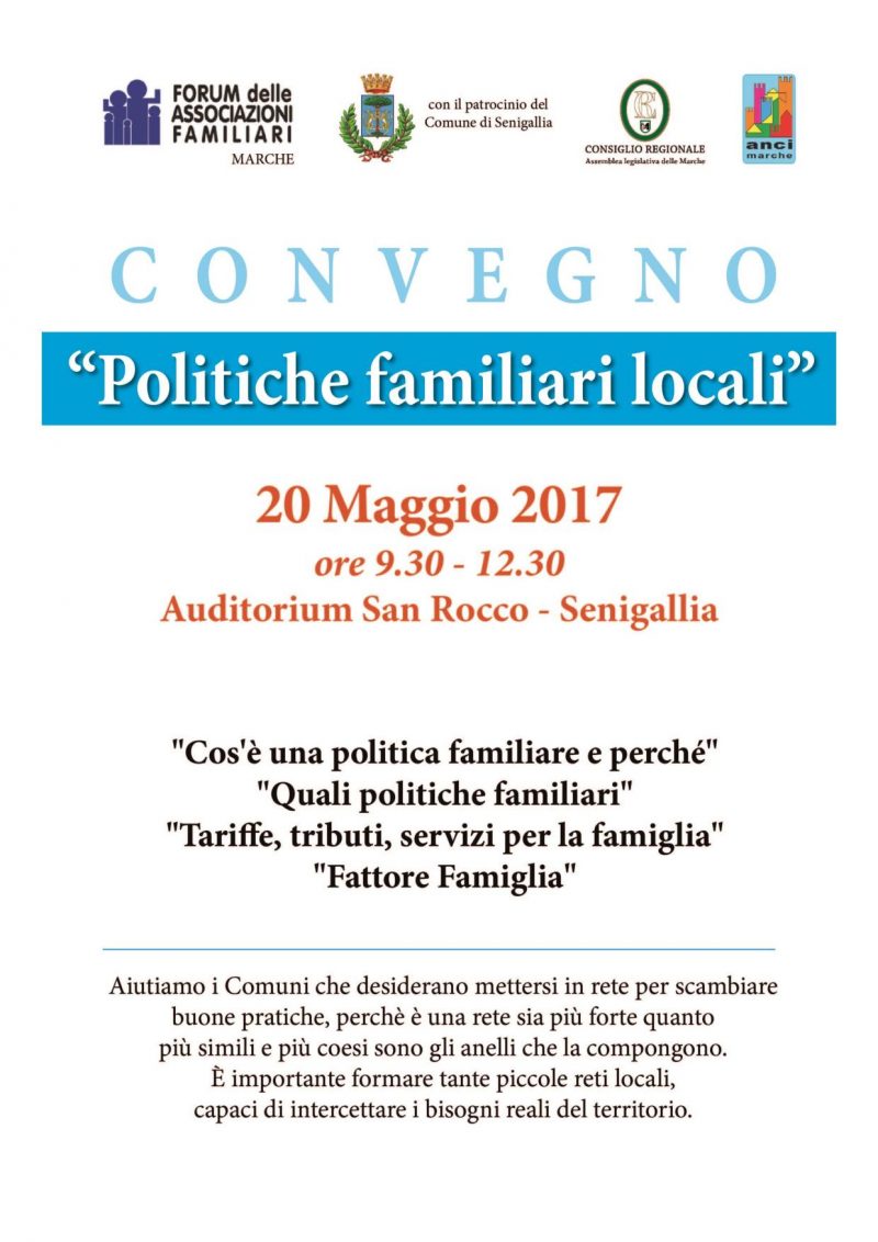 Organizzato dal Forum delle Associazioni familiari della Regione Marche, ANCI, RegioneMarche, con il patrocinio del Comune di Senigallia, il convegno vuole affrontare i problemi legati alle famiglie e le politiche in loro favore, dai servizi alle tariffe, ai bonus e contemporaneamente far rete con il tesoro delle buone pratiche… L’evento è previsto per il 20 maggio 2017 dalle ore 9.30 alle ore 12.30 all’Auditorium S.Rocco … Continua a leggere sabato20Maggio 00:00 Convegno politiche familiari locali 20/05/2017 00:00 »