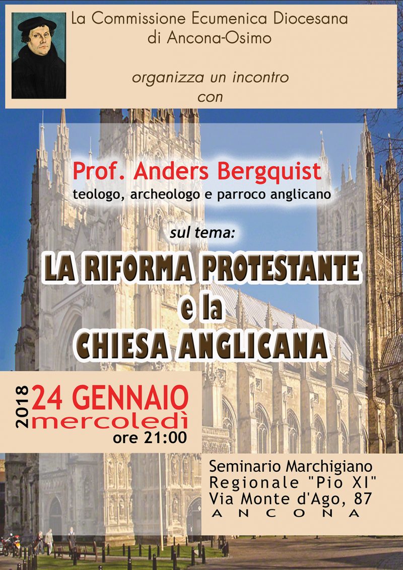 La riforma protestante e la Chiesa anglicana è il tema dell’incontro promosso dalla Commissione Ecumenica diocesana di Ancona Osimo, relatore il professor Anders Bergquist teologo, archeologo e parroco anglicano. Appuntamento mercoledì 24 gennaio 2018 alle ore 21:00 presso il Seminario regionale in Via Monte Dago ad Ancona