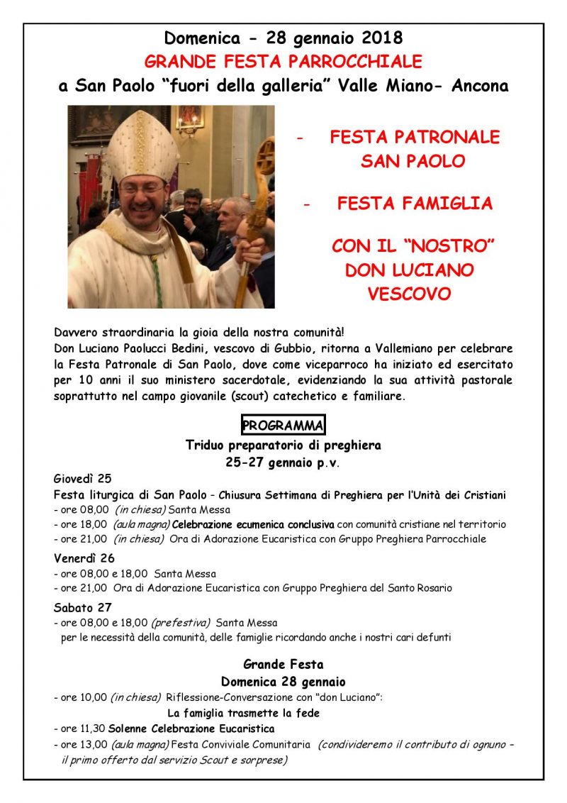 Per la Parrocchia di San Paolo a Vallemiano di Ancona, grande festa patronale della comunità e delle famiglie dal 25 al 27 gennaio 2018 con un triduo. Il 25 gennaio a conclusione della Settimana per l’unità dei cristiani, Celebrazione Ecumenica conclusiva. Domenica 28 febbraio, la comunità condivide la gioia della presenza di don Luciano Paolucci Bedini ora vescovo di Gubbio, che per 10 anni ha … Continua a leggere domenica28Gennaio 00:00 Festa a S.Paolo di Vallemiano 28/01/2018 00:00 »