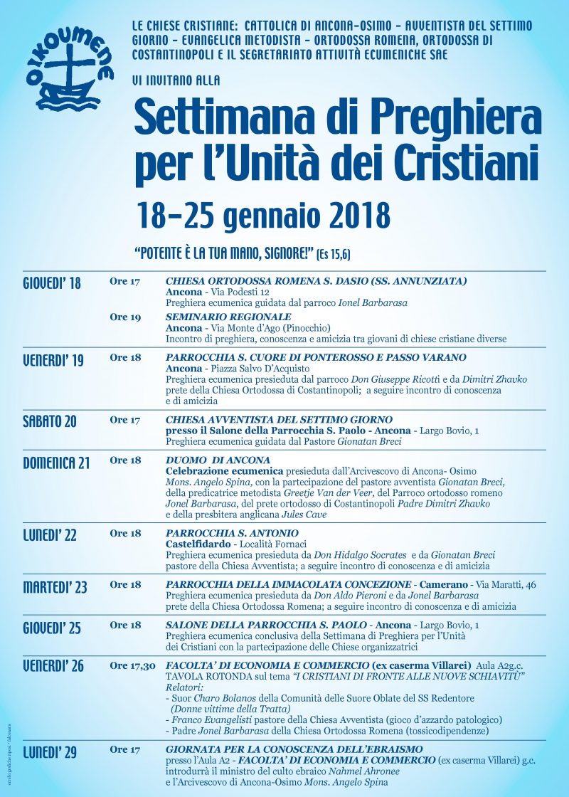 Settimana di preghiera per l’unità dei cristiani 2018 “Potente è la tua mano, Signore”: questo il versetto biblico, tratto da Esodo (15,6), scelto come filo rosso della Settimana di preghiera per l’unità dei cristiani 2018 che, come tutti gli anni, ricorre dal 18 al 25 gennaio. Promossa congiuntamente dalla commissione Fede e Costituzione del Consiglio ecumenico delle Chiese e dal Pontificio Consiglio per la promozione … Continua a leggere venerdì26Gennaio 00:00 tavola rotonda interconfessionale 26/01/2018 00:00 »