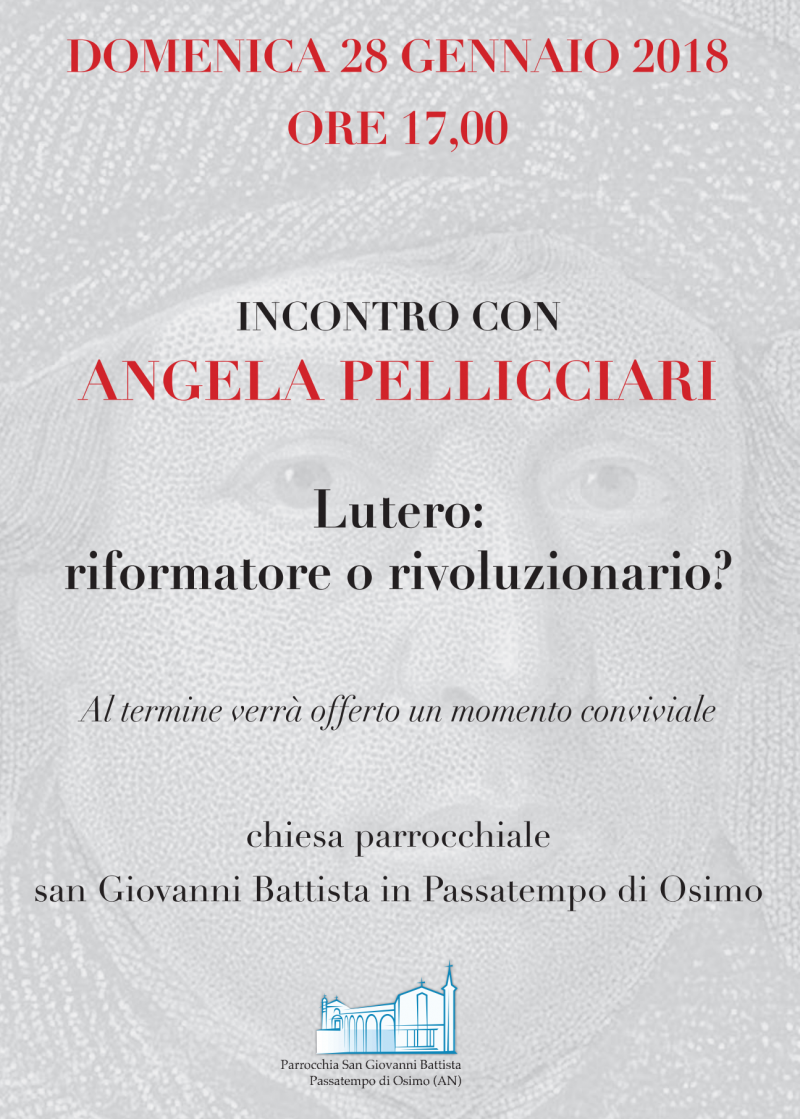 “Lutero: riformatore o rivoluzionario?”. Questo il titolo dell’incontro organizzato per domenica 28 gennaio 2018, alle ore 17, presso la parrocchia San Giovanni Battista in Passatempo di Osimo con la professoressa Angela Pellicciari, storica del Risorgimento, docente di Storia della Chiesa. L’evento è stato organizzato ricordando che il 31 ottobre 2017 è ricorso l’anniversario del cinquecentenario delle “95 tesi”, gesto che, per convenzione storica, è considerato … Continua a leggere domenica28Gennaio 00:00 Lutero: riformatore o rivoluzionario? 28/01/2018 00:00 »