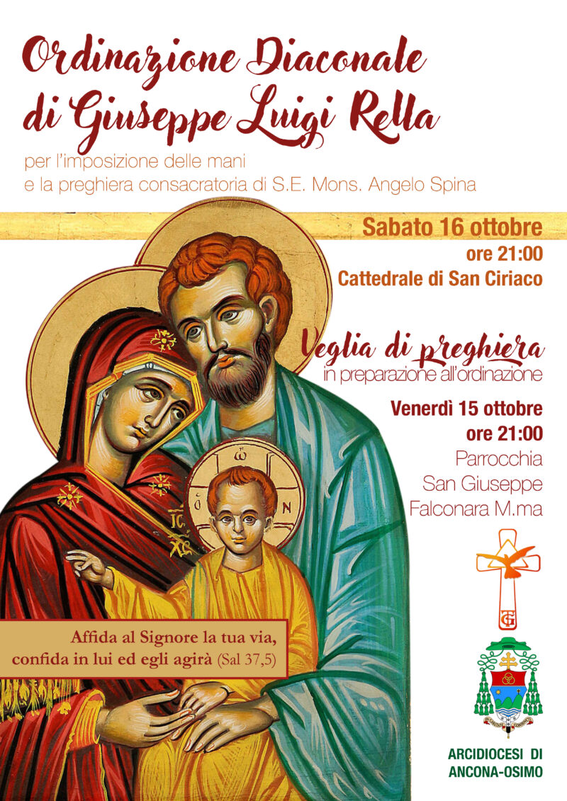 Eventi diocesani 11 Ottobre 2021 admindiocesi sabato 16 Ottobre 21:00 Ordinazione Diaconale di Giuseppe Luigi RellaInizio: 16/10/2021 21:00