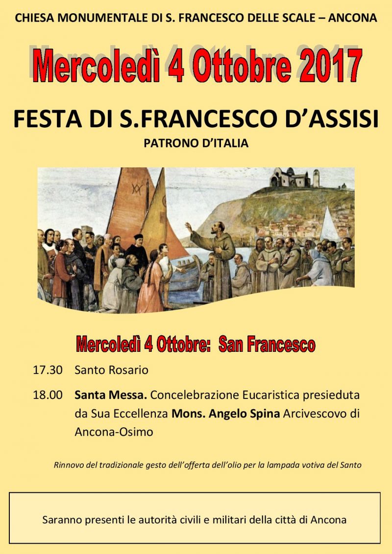 Mercoledì 4 ottobre 2017 presso la chiesa monumentale di S.Francesco alle Scale di Ancona, si celebra la festa di S.Francesco con una S.Messa concelebrata e presieduta del nostro nuovo arcivescovo Angelo Spina. Il programma prevede alle 17.30 la preghiera del Rosario cui seguirà alla 18.00 la concelebrazione eucaristica.