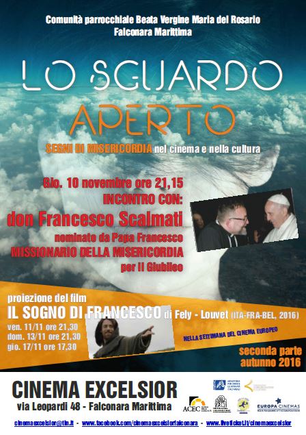 A Falconara, nella settimana del Cinema europeo, al cinema Excelsior, giovedì 10 novembre 2016 alle 21.15 incontro con d. Francesco Scalmati, uno dei missionari della Misericordia per il Giubileo. Seguirà nei giorni 11-13-17 la proiezione del film Il Sogno di Francesco. I particolari nella locandina pubblicata.