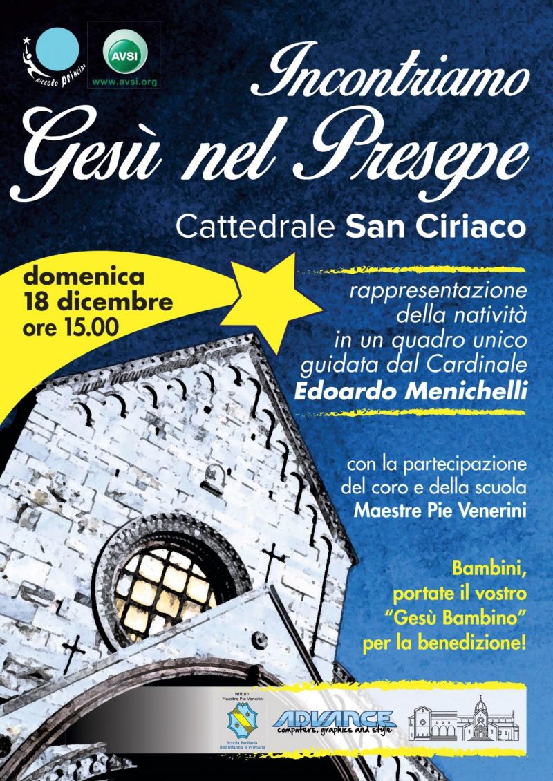 Domenica 18 dicembre2016 alle ore 15 un altro incontro di bambini per il Natale, a S.Ciriaco con la scuola Maestre Pie Venerini. Sarà rappresentata la natività in un quadro unico guidato dal nostro Vescovo Edoardo . Nel volantino che pubblichiamo, i particolari.