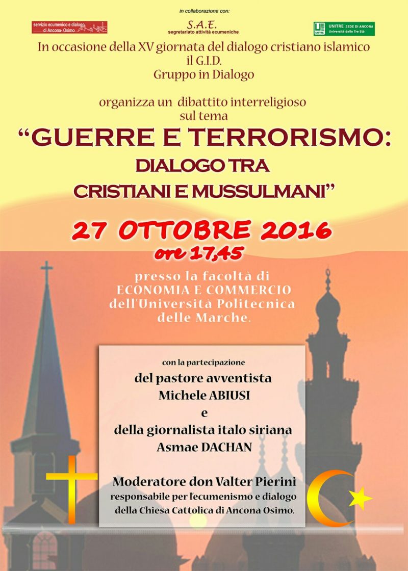 In occasione della XV giornata del dialogo cristiano-islamico, il GID, Gruppo In Dialogo, organizza giovedì 27 ottobre 2016 ad Ancona, presso la facoltà di Economia e commercio – piazza Martelli alle ore 17.45 un dibattito interreligioso sul tema: Guerra e terrorismo: dialogo tra cristiani e mussulmani. Interverranno: Michele Abiusi Pastore avventista e Asmae Dachan giornalista italo siriana. Moderatore: d. Valter Pierini responsabile per l’ecumenismo e … Continua a leggere giovedì27Ottobre 00:00 Guerra e terrorismo: dialogo tra cristiani e mussulmani 27/10/2016 00:00 »