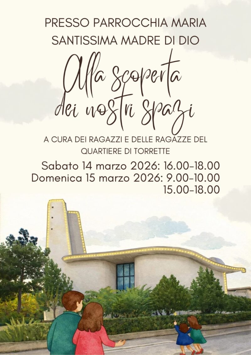 Eventi parrocchiali 11 Marzo 2026 admindiocesi sabato 14 Marzo 16:00 Alla scoperta dei nostri spaziInizio: 14/03/2026 16:00