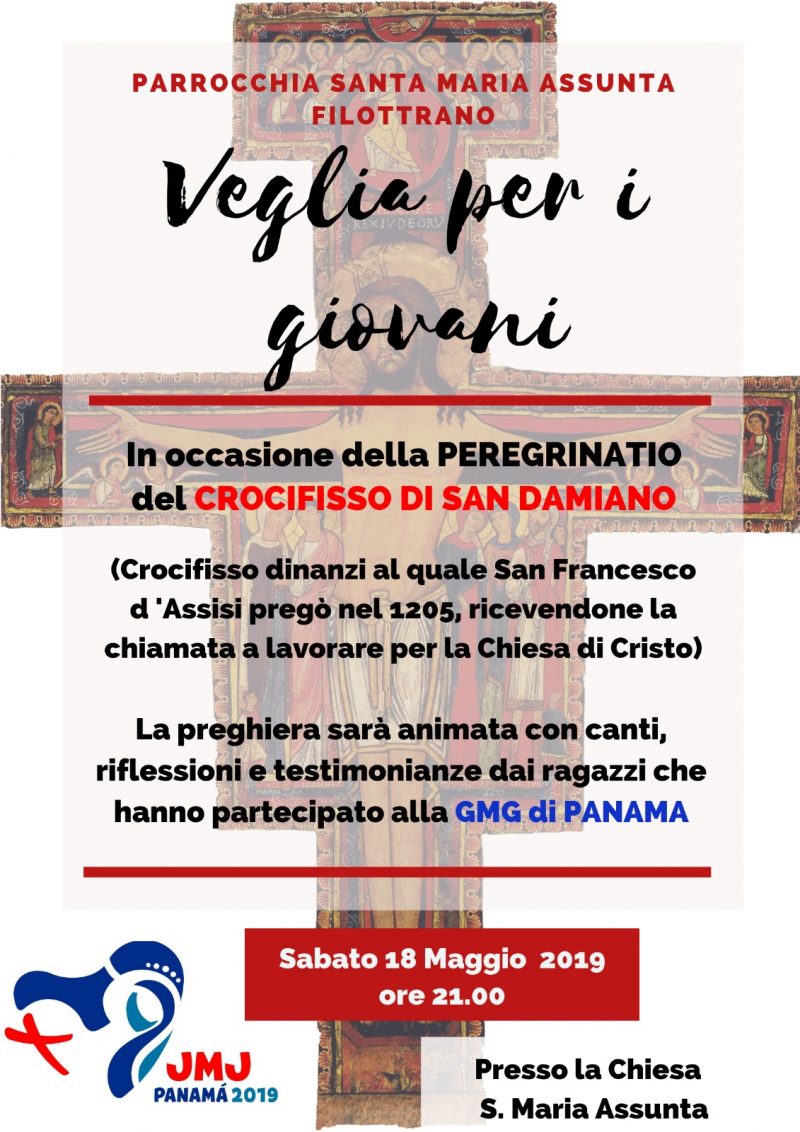 In occasione della peregrinatio del Crocifisso di S.Damiano, sabato 18 maggio 2019 alle ore 21 presso la Chiesa di S.Maria Assunta a Filottrano, un momento di preghiera con canti, riflessioni e testimonianze condotto dai ragazzi che hanno partecipato alla Giornata Mondiale della Gioventù a Panama. I particolari del programma, nella locandina che pubblichiamo