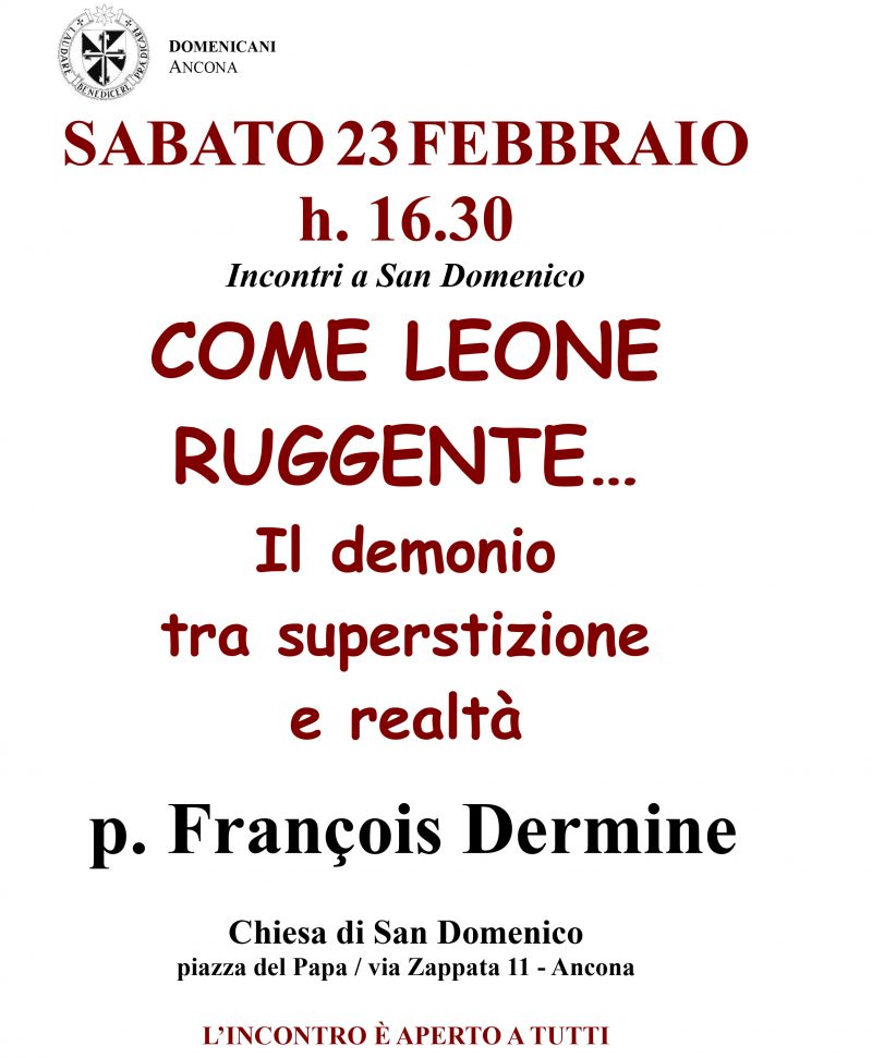 Sabato 23 febbraio 2019, alle ore 16:30, nella chiesa di San Domenico ad Ancona (con ingresso da piazza del Papa e da via Zappata 11), un nuovo appuntamento con gli Incontri a San Domenico. Condurrà l’incontro padre François Dermine, docente di Teologia morale ed esorcista, che parlerà sul tema: Come leone ruggente… Il demonio tra superstizione e realtà. In continuità con il suo precedente incontro … Continua a leggere sabato23Febbraio 00:00 Incontri a S. Domenico: il demonio tra superstizione e realtà 23/02/2019 00:00 »