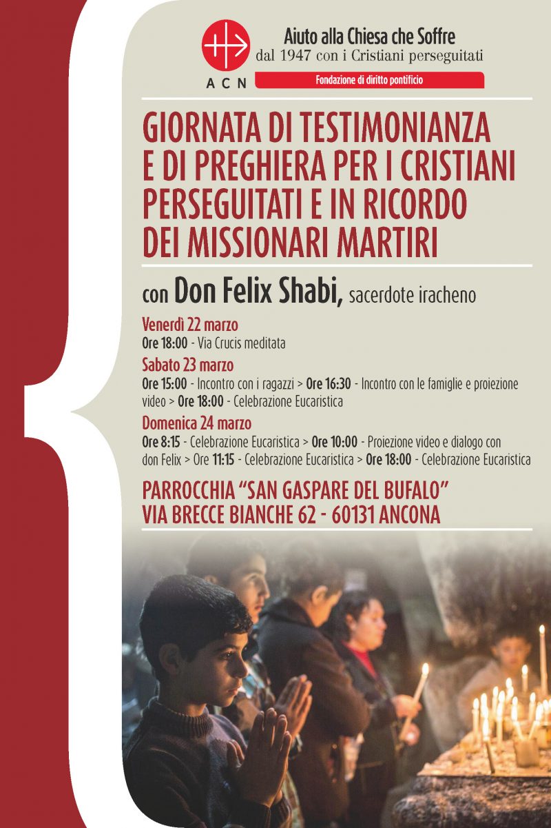 In occasione della XXVI giornata di preghiera e digiuno in memoria dei martiri missionari, la parrocchia San Gaspare del Bufalo propone nei tre gg 22-24 marzo una testimonianza/incontro con una chiesa che soffre la persecuzione. (cfr. locandina)
