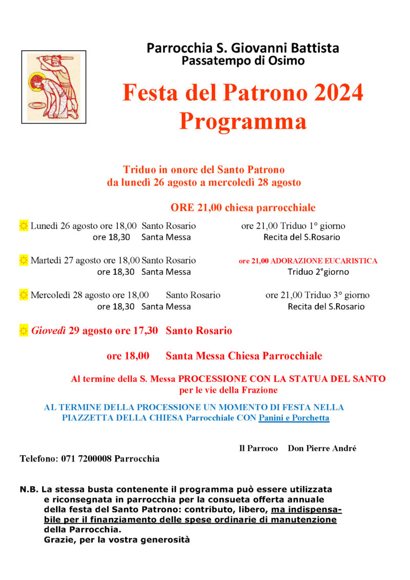 Eventi parrocchiali 20 Agosto 2024 admindiocesi giovedì 29 Agosto Festa del Patrono Parrocchia Passatempo di OsimoData: 29/08/2024