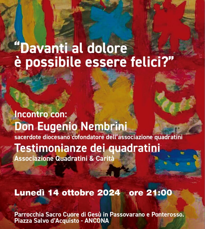 Eventi parrocchiali 14 Ottobre 2024 admindiocesi lunedì 14 Ottobre 21:00 Davanti al dolore è possibile essere felici?Inizio: 14/10/2024 21:00