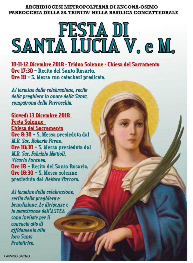 Nella Chiesa del Sacramento, a Osimo si festeggia solennemente la Santa, tra l’altro patrona della ASTEA spa società di produzione e fornitura di energia elettrica e gas nella zona. Il 10 dicembre 2018, inizia il triduo solenne che prepara alla festa di giovedì 13. Sono previsti vari appuntamenti di preghiera e celebrazioni secondo le indicazioni del volantino che pubblichiamo.