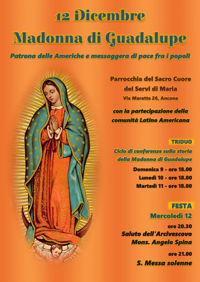 La vergine di Guadalupe apparsa in Messico nel 1531 porta un messaggio di pace, non solo all’America Latina di cui è la patrona, ma all’umanità intera. Ieri come oggi ci invita a guardare oltre gli ostacoli apparentemente insuperabili della diversità, di lingua, di cultura, di religione e a riconoscerci come fratelli e sorelle. La comunità dei Servi di Maria della Parrocchia del Sacro Cuore, in … Continua a leggere mercoledì12Dicembre 00:00 Madonna di Guadalupe, patrona delle Americhe e messaggera di pace fra i popoli 12/12/2018 00:00 »