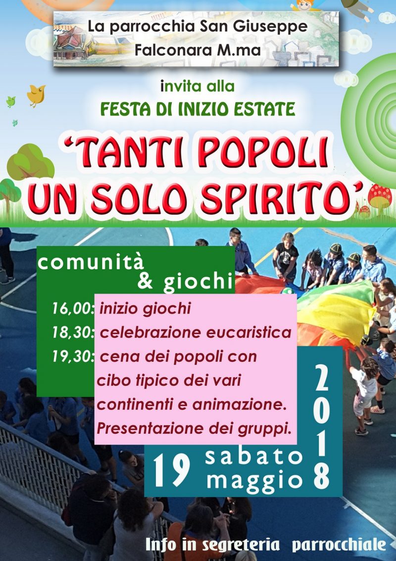 La parrocchia di S:Giuseppe a Falconara invita alla festa di inizio estate all’insegna della fraternità tra i popoli. Appuntamento sabato 19 maggio 2018 alle ore 16 con proseguo fino alle 19.30 con la cena nello scambio di conoscenza dei gruppi e dei cibi!! Info presso la parrocchia. Vedi anche locandina che pubblichiamo.