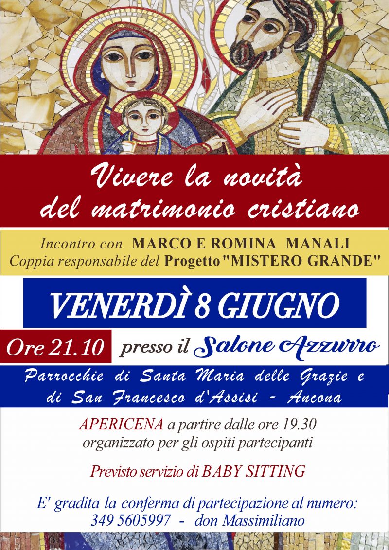 Venerdì 8 giugno 2018 alle ore 21.15 presso il Salone Azzurro della parrocchia di S. Maria delle Grazie ad Ancona, nell’ambito della festa della famiglia 2018, incontro con Marco e Romina Manali coppia responsabile del progetto “Mistero grande”. Apericena a partire dalle 19.30. Servizio di baby sitter. E’ gradita la conferma della partecipazione a don Massimiliano cell.3495605997.