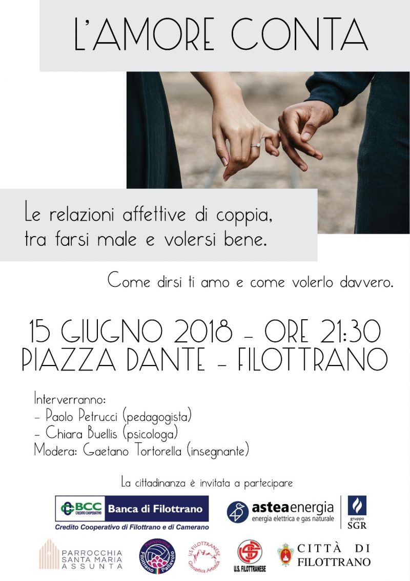 Nel mese di giugno, a Filottrano, si ricorda la dedicazione della Parrocchia intitolata a S.Maria Assunta con un incontro aperto a tutta la cittadinanza. Anche quest’anno 2018, a piazza Dante, il 15 giugno, ore 21.30 si tratterà un argomento di forte attualità. La tematica riguarda il vivere la relazione affettiva nella coppia “tra farsi male e volersi bene” come recita il volantino. Contributi di un … Continua a leggere venerdì15Giugno 00:00 L’amore conta: incontro a Filottrano 15/06/2018 00:00 »