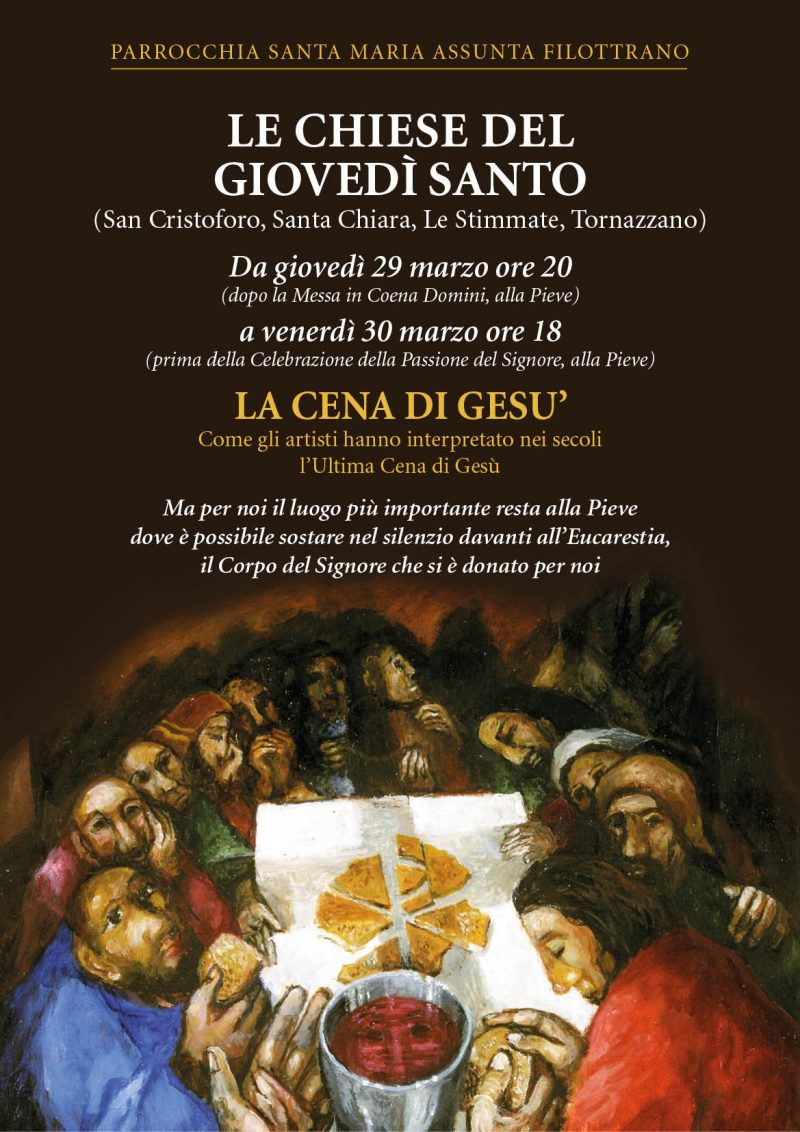Promosso dalla parrocchia S.Maria Assunta di Filottrano nei giorni della Settimana santa un evento che ripercorre l’ultima cena di Gesù con gli artisti che l’hanno interpretata nei secoli. Da giovedì 29 marzo alle ore 20 (dopo la Messa in Coena Domini alla Pieve) fino a venerdì 30 marzo 2018 (prima della celebrazione della Passione del Signore alle ore 18 alla Pieve), si propone un percorso … Continua a leggere venerdì30Marzo 00:00 Le chiese del Giovedì Santo a Filottrano 30/03/2018 00:00 »