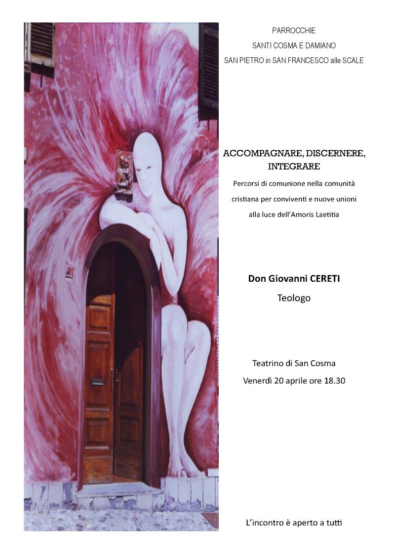 Papa Francesco con l’Amoris Laetitia ha cercato di approfondire anche le riflessione sulle realtà odierne legate alle tante sofferenze ed emergenze della vita matrimoniale e dei percorsi di coppia. E’ su questi “percorsi di comunione nella comunità cristiana per conviventi e nuove unioni” che vogliono riflettere le parrocchie dei Ss. Cosma e Damiano e di S. Francesco alle Scale con il contributo del teologo Giovanni Cereti … Continua a leggere venerdì20Aprile 00:00 Accompagnare, discernere integrare 20/04/2018 00:00 »