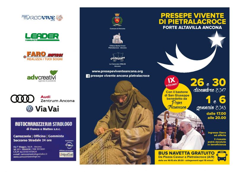 Sempre più articolato e ricco di elementi il presepe vivente che a Forte Altavilla di Pietralacroce ad Ancona, ogni anno fa rivivere l’evento del Natale di Gesù. Rappresentazioni il 26 e 30 dicembre 2017 e l’1 e 6 gennaio 2018 dalle ore 17 alle 20. Un bus navetta gratuito effettua il servizio da Piazza Cavour a Pietralacroce (A/R). Tutti i particolari nel pieghevole che pubblichiamo.