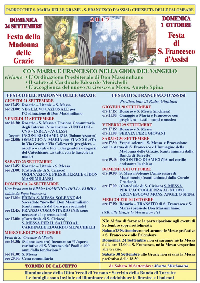 Un nutritissimo programma per la festa della Madonna delle Grazie e di S.Francesco d’Assisi a cura della parrocchia di S.Maria delle Grazie, di S.Francesco d’Assisi e della Chiesetta delle Palombare. Pubblichiamno la locandina che esprime nella totalità gli appuntamenti e le comunicazioni in merito.