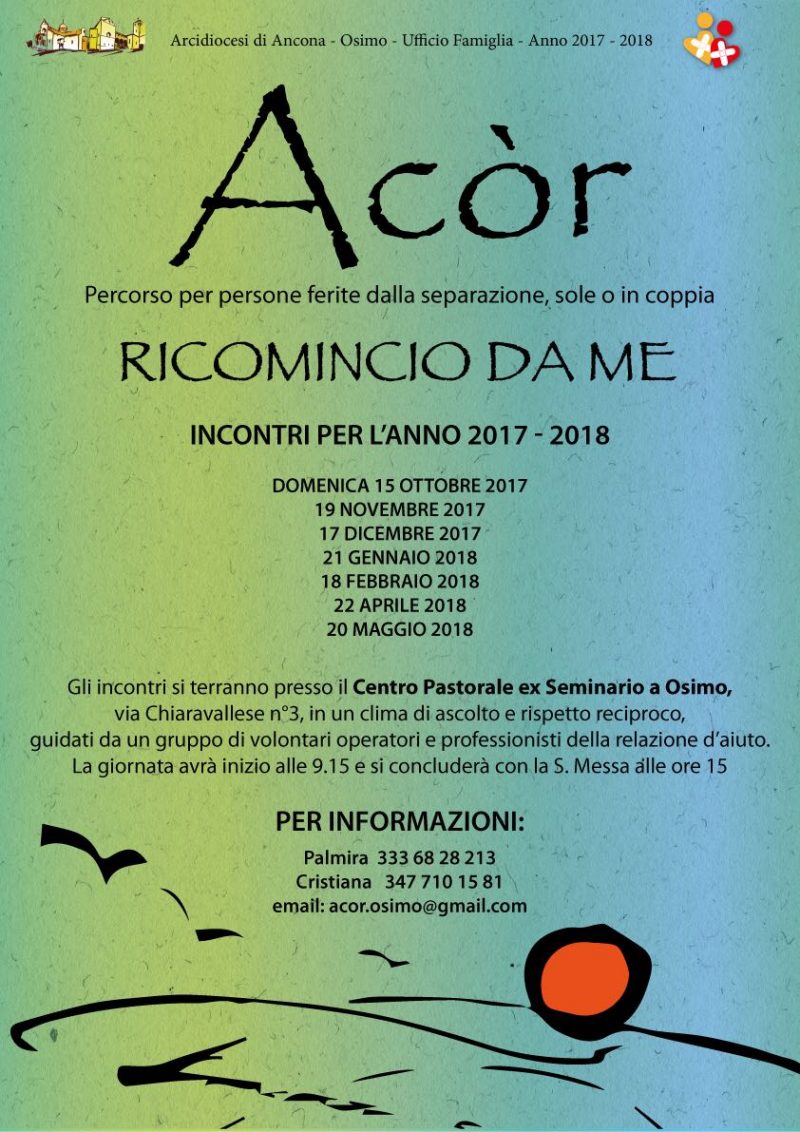 Riprendono ad Osimo nei locali dell’ex Seminario, gli incontri per persone ferite dalla separazione, sole o in coppia, per un percorso programmato mensilmente, per il 2017.18 da ottobre a maggio. La giornata inizierà alle 9.15 per concludersi con la S.Messa alle ore 15. Nel volantino che pubblichiamo, le date e le indicazioni per contatti o informazioni.