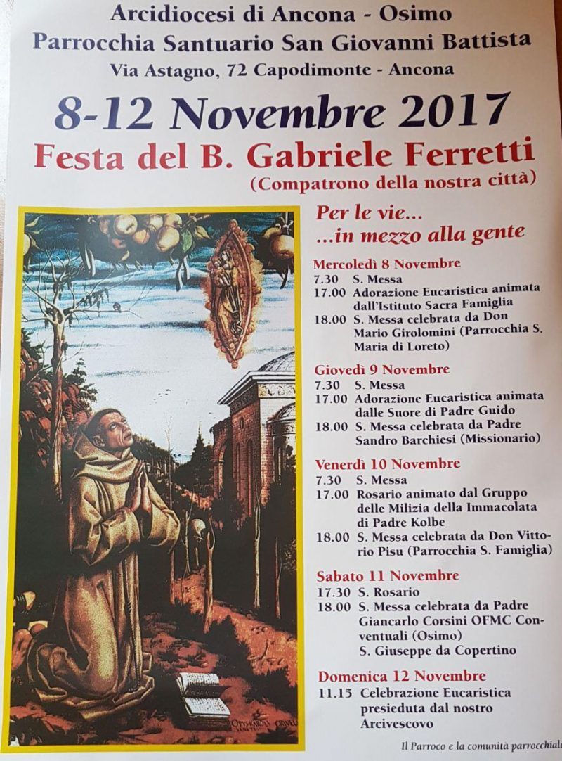 La Parrocchia-Santuario di S.Giovanni Battista, a Capodimonte di Ancona, celebra dall’ 8 al 12 novembre 2017 la festa del beato Gabriele Ferretti compatrono di Ancona. Il programma prevede ogni giorno momenti di adorazione e di preghiera e la celebrazione dell’’Eucarestia cui parteciperanno Associazioni diocesane e presbiteri della chiesa di Ancona Osimo. Domenica 12 novembre la S.Messa sarà celebrata dal nostro Arcivescovo mons. Spina Gabriele Ferretti … Continua a leggere domenica12Novembre 00:00 Festa beato Gabriele Ferretti Compatrono di Ancona 12/11/2017 00:00 »