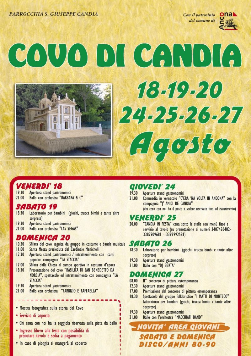 A Candia, frazione di Ancona, dal 18 al 27 Agosto 2017 la parrocchia di s.Giuseppe accompagna la tradizionale festa del Covo e la sfilata per le vie del paese. Sono previsti spettacoli, animazione per bambini, musica, stand gastronomici e molto altro come da locandina pubblicata.