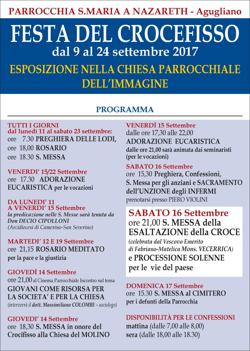 Il Crocifisso, volto delle beatitudini. Questo il tema della festa del Crocifisso che si svolgerà dal 9 al 24 settembre 2017 ad Agugliano con un nutrito programma religioso e culturale rivolto a tutte le fasce della popolazione con momenti diversi di approfondimento, di riflessione, di preghiera, di divertimento. L’immagine antica e venerata del Crocifisso sarà esposta nella parrocchia di S. Maria a Nazareth. Il giorno … Continua a leggere domenica24Settembre 00:00 Agugliano: festa del Crocifisso 24/09/2017 00:00 »