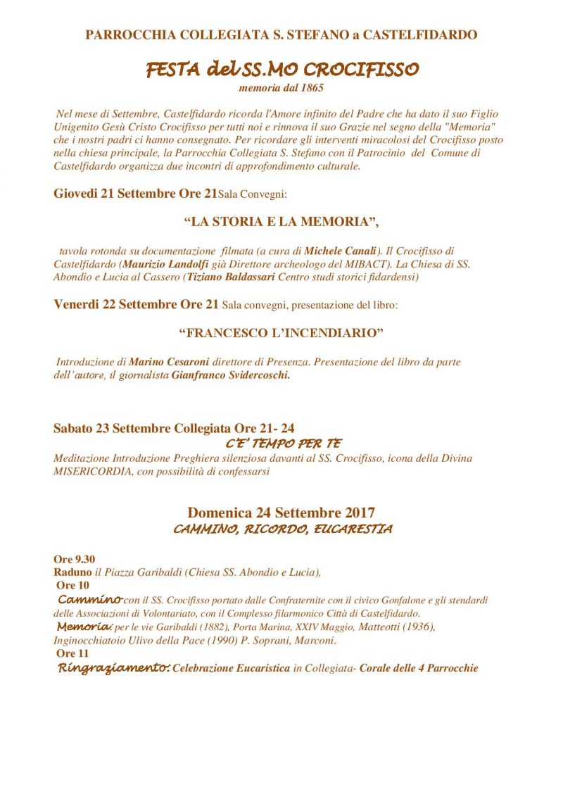 Dal 21 al 24 settembre 2017 la Parrocchia Collegiata S. Stefano con il Patrocinio del Comune di Castelfidardo per ricordare gli interventi miracolosi del Crocifisso posto nella chiesa principale organizza alcuni incontri di approfondimento culturale ma anche di approfondimento spirituale. Il tutto nel segno della storia e della memoria , nel ringraziamento in un cammino che non perde la speranza. Tutto il programma nella locandina … Continua a leggere domenica24Settembre 00:00 La festa del Crocifisso alla Collegiata di Castelfidardo 24/09/2017 00:00 »