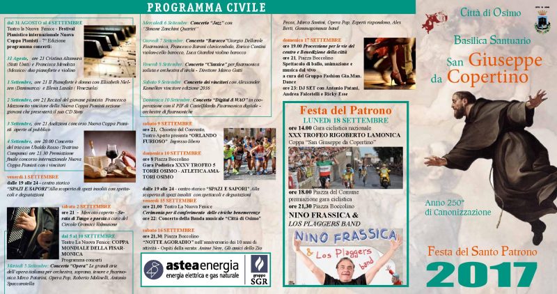Osimo festeggia anche quest’anno, il suo santo famosissimo patrono S.Giuseppe da Copertino. Dal 31 agosto al 18 Settembre 2017 una serie di eventi religiosi, culturali ,sportivi, musicali. Pubblichiamo qui i due programmi con tutti gli appuntamenti.