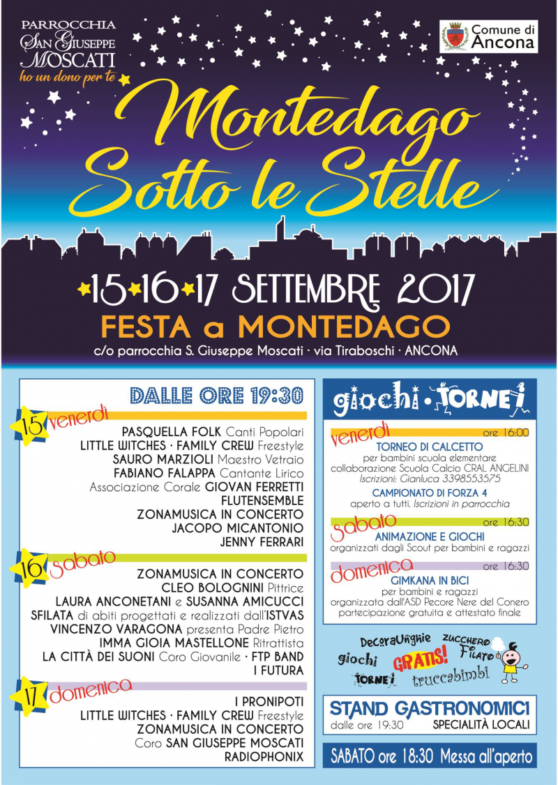 Festa a Montedago, in Ancona, il 15-16-17 settembre, la sera, dopo le 19.30 presso e con la parrocchia S.Giuseppe Moscati in via Tiraboschi. Montedago si accende di spettacolo: un dono per gli abitanti del territorio e oltre. Nei tre giorni, eventi culturali e musicali, con spazi, dalle 16.00, dedicati ai ragazzi. Non possono mancare gli stand gastronomici con specialità locali! La Messa, sabato alle 19.30 … Continua a leggere domenica17Settembre 00:00 Montedago sotto le stelle 17/09/2017 00:00 »