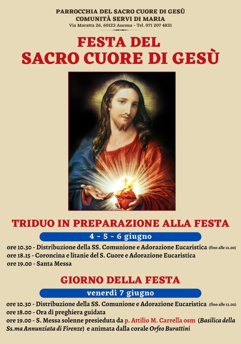 Eventi parrocchiali 29 Maggio 2024 admindiocesi venerdì 7 Giugno 18:30 Festa del Sacro CuoreInizio: 07/06/2024 18:30