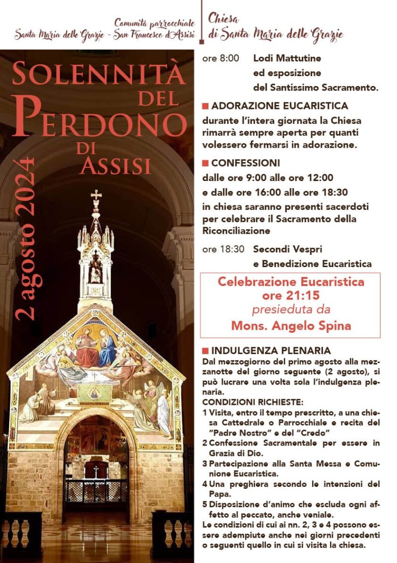 Eventi parrocchiali 31 Luglio 2024 admindiocesi venerdì 2 Agosto Festa del PERDONO di ASSISIData: 02/08/2024