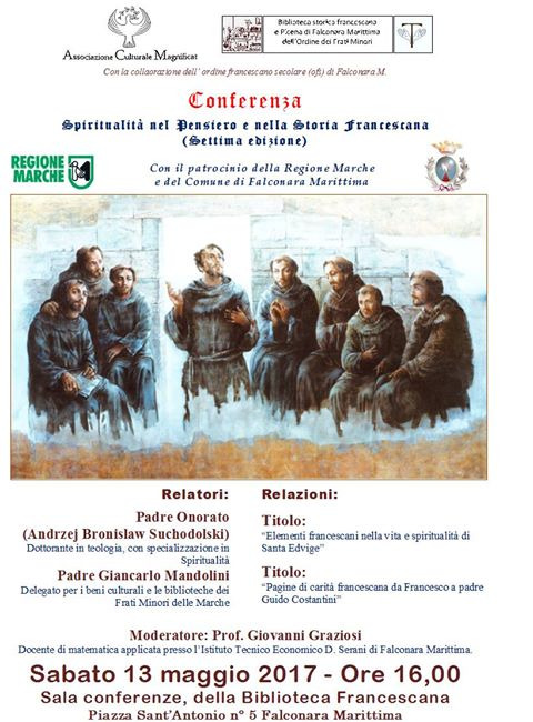Organizzata dalla Biblioteca Storica Francescana dei frati minori con l’associazione culturale Magnificat, la VII edizione della rassegna sulla “Spiritualità nel pensiero e nella storia francescana dei frati minori” . L’evento si svolge sabato 13 maggio 2017 alle ore 16 a Falconara M. presso la sala conferenze della Biblioteca francescana. Relatori p. Onorato Suchodolski sulla spiritualità francescana in S.Edvige e p. G. Mandolini a 50 anni … Continua a leggere sabato13Maggio 00:00 Spiritualità nel pensiero e nella storia francescana dei frati minori 13/05/2017 00:00 »