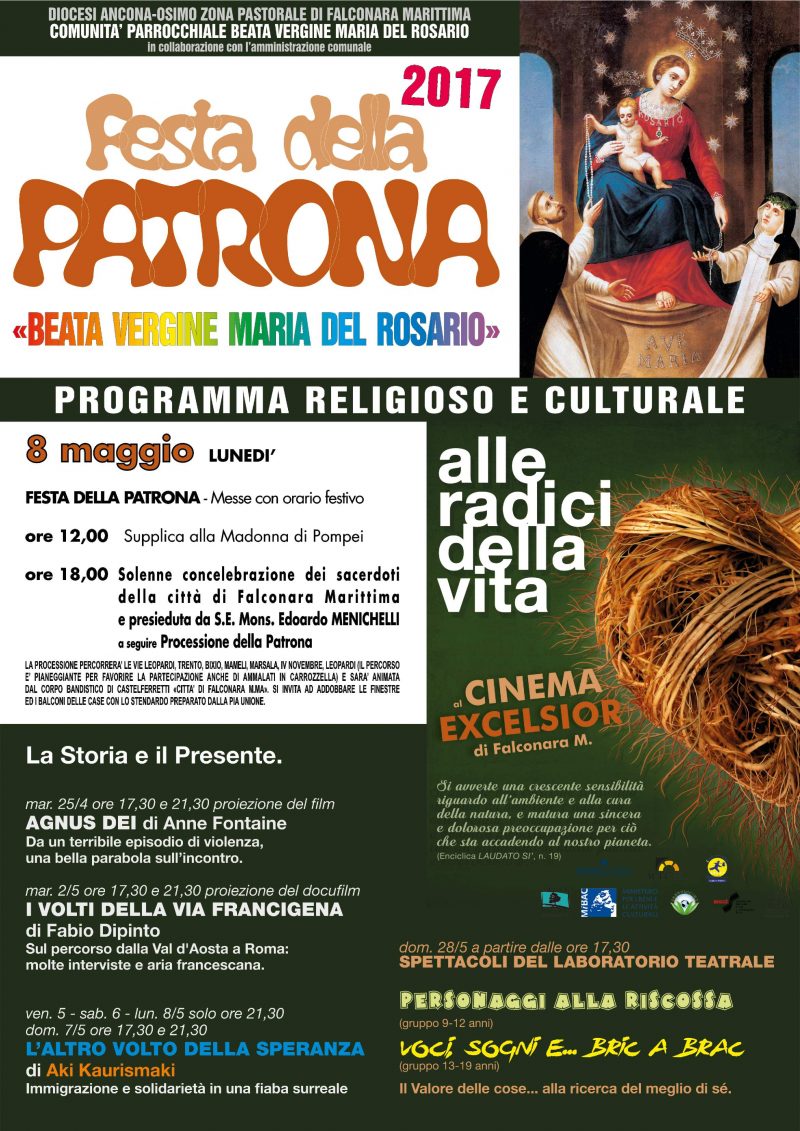 Il programma religioso prevede, lunedì 8 maggio 2017 festa della Beata Vergine Maria del Rosario Patrona di Falconara, alle ore 12 SUPPLICA ALLA MADONNA DI POMPEI e alle ore 18 la CONCELEBRAZIONE di tutti i sacerdoti della città di Falconara presieduta da S.E. Mons. Edoardo MENICHELLI e, a seguire, la processione per le vie della città.